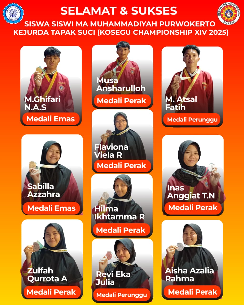 Purwokerto, 30 Oktober 2025 – Semangat juang dan kerja keras para siswa MA Muhammadiyah Purwokerto kembali membuahkan hasil yang membanggakan. Dalam ajang Kejuaraan Daerah (KEJURDA) Tapak Suci KOSEGU CHAMPIONSHIP XIV Tahun 2025 yang digelar oleh PIMDA Tapak Suci Banyumas, para atlet muda dari MA Muhammadiyah Purwokerto sukses menorehkan prestasi luar biasa.
